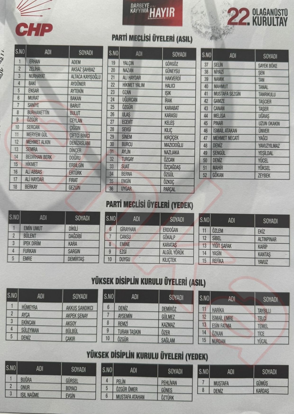 “Darbeye, kayyıma hayır” sloganıyla 22. Olağanüstü Kurultayı’nı gerçekleştiren CHP’de, Parti Meclisi ve Yüksek Disiplin Kurulu’na iki yeni üye girdi. Özel’in blok listesine göre; PM’de Hakan Uyanık yerine Sercan Çığgın yer alacak. Çankaya İlçe Başkanı olduğu için YDK’daki görevinden ayrılan Ali Balta‘nın yerine ise Edirne İl Başkanlığı’nı yürüten Harika Taybıllı gelecek.